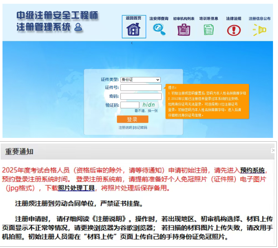 2025年度中级注册安全工程师考试合格人员(资格后审的除外,请等待通知)申请初始注册,请先进入预约系统,预约登录注册系统时间。