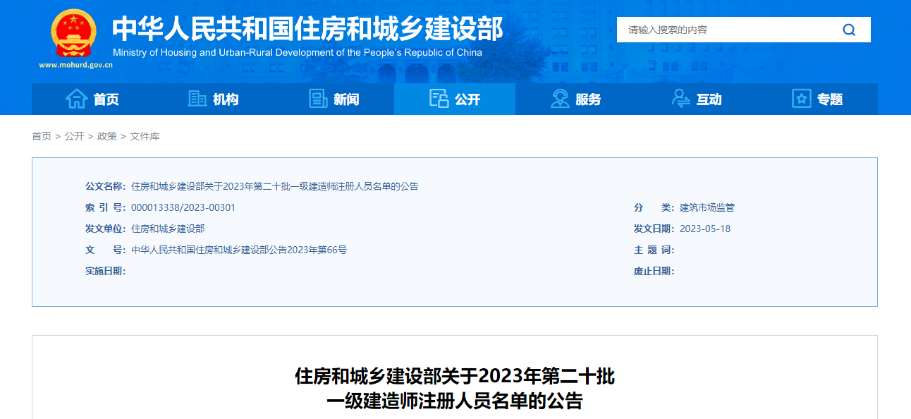 近日,中华人民共和国住房和城乡建设部发布《住房和城乡建设部关于2023年第二十批一级建造师注册人员名单的公告》,27500名申请一级建造师注册的人员符合注册条件,准予注册。
