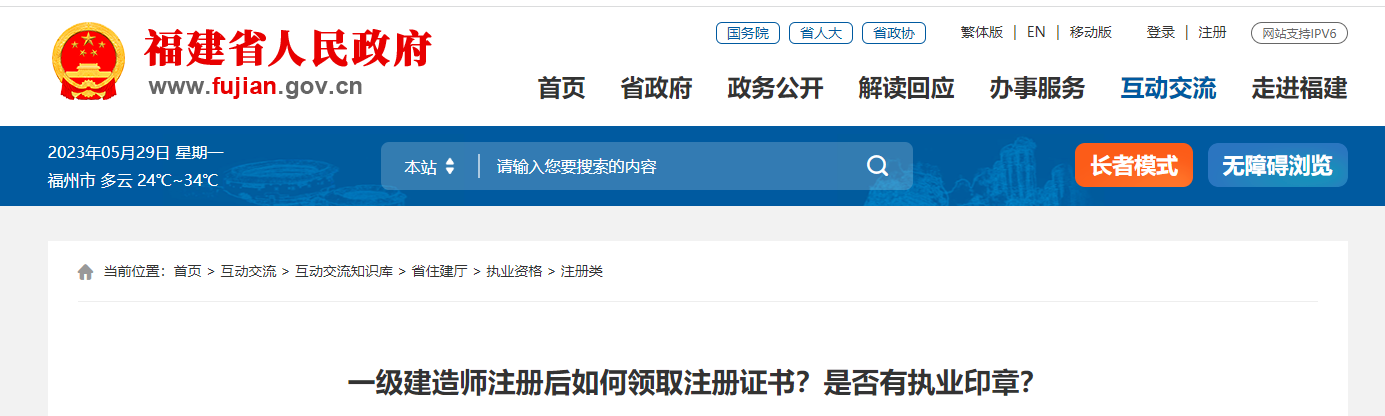 近日,福建省人民政府发布关于“一级建造师注册后如何领取注册证书?是否有执业印章?”的问题解答,回答了一级建造师注册的相关问题。