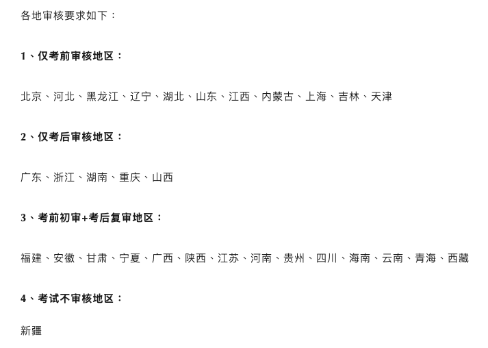 2、考后审核:意思是在考试结束后再对报考人员的报考资格进行审核。考生在报名时先自行确定自己是否符合报名条件,缴费成功即视为报名成功,可以参加当年考试。待成绩公布后,合格的考生需要根据通知去指定地点进行资格审核,若审核不通过,则成绩无效不给予发放合格证书。