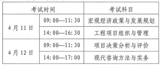 咨询工程师(投资)职业资格考试设《宏观经济政策与发展规划》(客观题)《工程项目组织与管理》(客观题)《项目决策分析与评价》(客观题)和《现代咨询方法与实务》(主观题)4个考试科目。具体考试时间及科目如下: