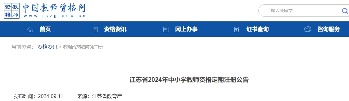 9月11日,江苏省教育厅发布了《江苏省2024年中小学教师资格定期注册公告》,当中明确了9月18日至10月10日内教师应通过中国教师资格网(www.jszg.edu.cn)进行定期注册网上申报,按所属教育局时间安排,按时、按要求准备书面材料。