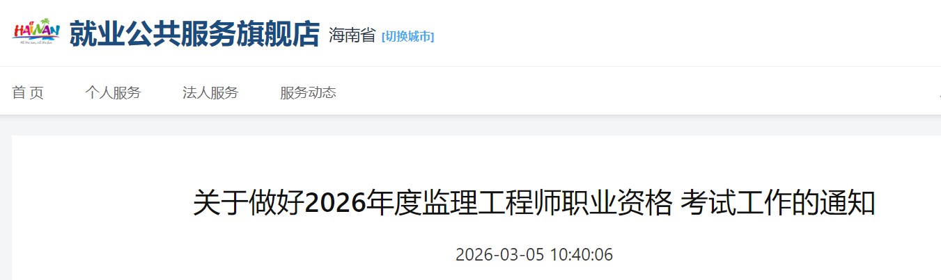 根据《人力资源社会保障部办公厅关于2026年度专业技术人员职业资格考试计划及有关事项的通知》(人社厅发〔2026〕6号)和《关于2026年度监理工程师职业资格考试考务工作的通知》(人考中心函〔2026〕3号)安排,2026年度监理工程师职业资格考试定于5月16日、17日举行,结合我省实际,现将有关事项通知如下: