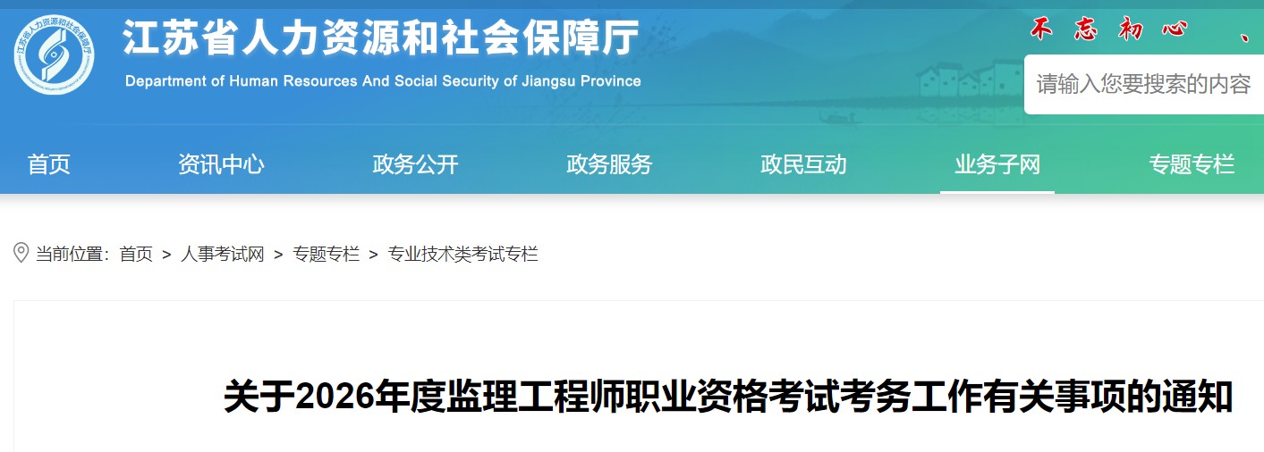 根据人力资源和社会保障部人事考试中心《关于2026 年度监理工程师职业资格考试考务工作的通知》(人考中心 函〔2026〕3号)和省人力资源社会保障厅《关于进一步加 强我省专业技术资格考试资格审查工作的通知》(苏人社发 〔2018〕383号)精神,为做好我省2026年度监理工程师职 业资格考试工作,现将有关事项通知如下: