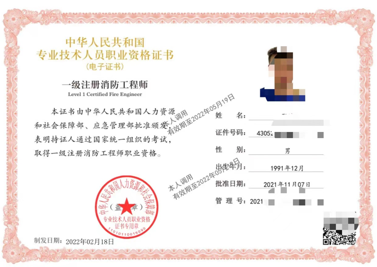 一级消防工程师电子证书样本如图所示: