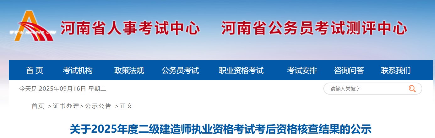 河南省人事考试中心于近日发布《关于2025年度二级建造师执业资格考试考后资格核查结果的公示》,2025年河南二级建造师成绩合格人员考后资格核查结果已出,9月12日-9月18日进行公示。