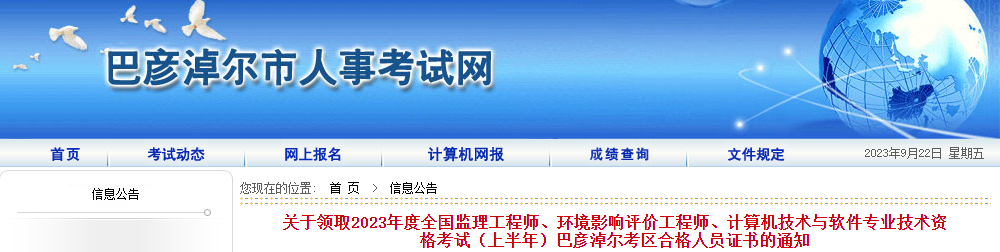 9月12日,巴彦淖尔市人事考试网发布了“关于领取2023年度全国监理工程师巴彦淖尔考区合格人员证书的通知”,现将有关考试合格人员证书领取事宜通知如下。