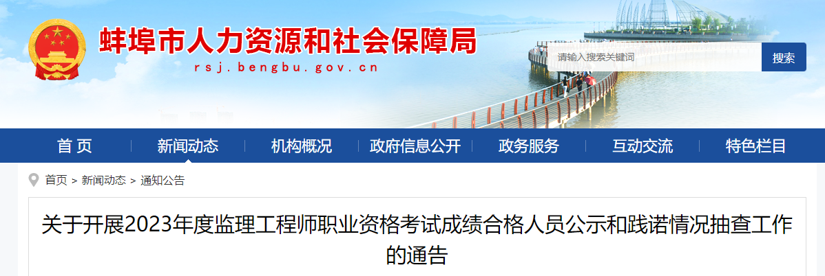 7月25日,蚌埠市人力资源和社会保障局发布了“关于开展2023年度监理工程师职业资格考试成绩合格人员公示和践诺情况抽查工作的通告”,公示期为2023年7月25日至2023年8月3日。
