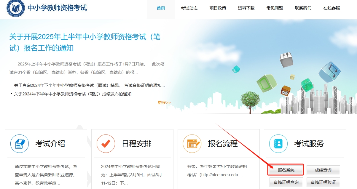 首先,打开中小学教师资格考试的官方网站。找到页面右下角的“考生服务”,点击进入“报名系统”。
