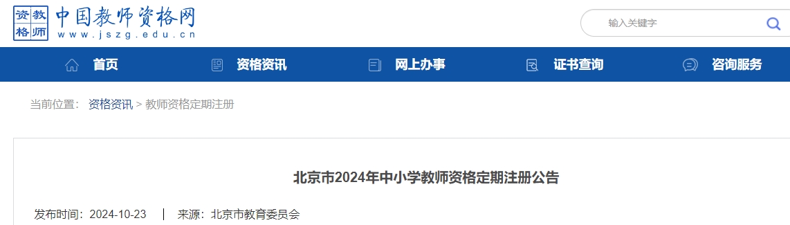 10月23日,北京市教育委员会发布了《北京市2024年中小学教师资格定期注册公告》,当中明确了2024年北京市中小学教师资格定期注册网报时间:10月22日至11月18日。