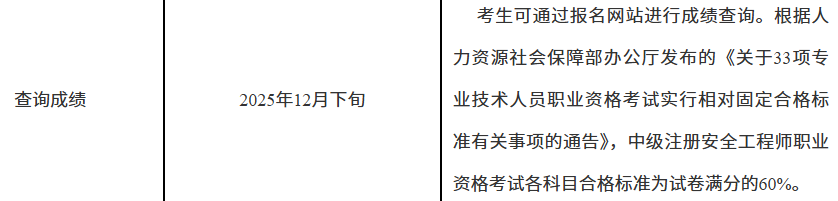 根据中国人事考试网2月18日发布的通知《2025年度专业技术人员职业资格考试重要事项提示》,其中公布了2025年注册安全工程师成绩查询时间预告,将于12月下旬公布考试成绩。如下图所示: