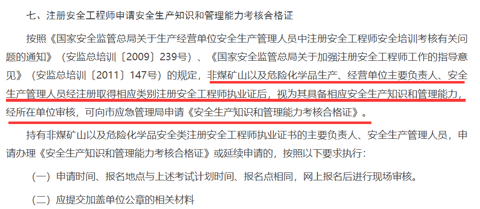 12月26日北京市应急管理局发布的《北京市应急管理局关于2024年矿山、金属冶炼、危险化学品等生产经营单位主要负责人及安全生产管理人员安全生产知识和管理能力考核安排的通告》,非煤矿山以及危险化学品生产、经营单位主要负责人、安全生产管理人员经注册取得相应类别注册安全工程师执业证后,视为其具备相应安全生产知识和管理能力,经所在单位审核,可向市应急管理局申请《安全生产知识和管理能力考核合格证》。第七项:原文截图如下: