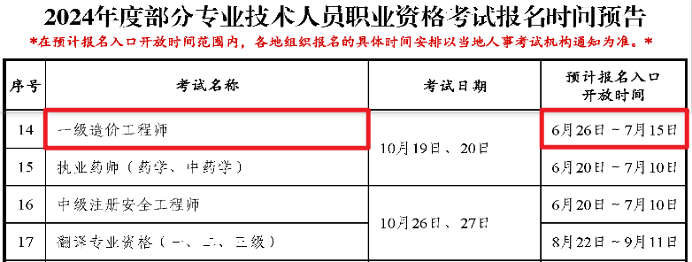 根据《2024年度专业技术人员职业资格考试重要提示》可知,2024年一级造价工程师报名时间预计为2024年6月26日至7月15日,各地报名时间有所差异。