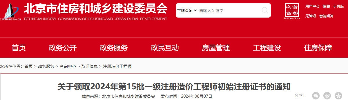 2024年8月7日,北京市住房和城乡建设委员会发布了《关于领取2024年第15批一级注册造价工程师初始注册证书的通知》,其中明确北京一级造价师初始注册证书已制作完毕,相关人员需进行现场领证。