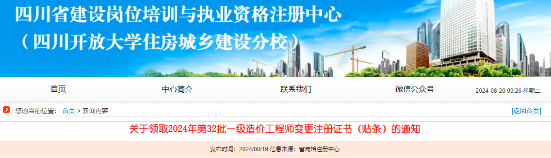 2024年8月19日,四川省建设岗位培训与执业资格注册中心发布了《关于领取2024年第32批一级造价工程师变更注册证书(贴条)的通知》,其中明确该省一级造价师证书变更注册已办结,相关人员可进行现场领证或邮寄申领。