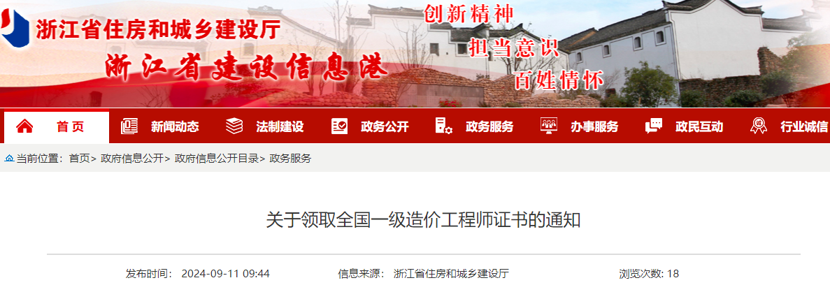2024年9月11日,浙江省住房和城乡建设厅发布了《关于领取全国一级造价工程师证书的通知》,其中明确浙江省一级造价师初始注册已办结,相关人员需携带相关证件进行领证。