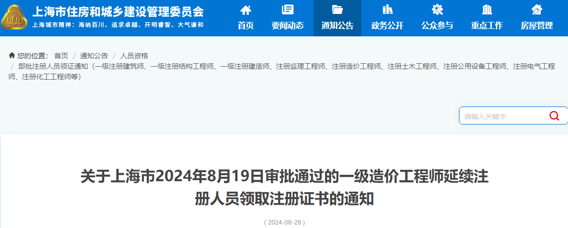 2024年8月28日,上海市住房和城乡建设管理委员会发布了《关于上海市2024年8月19日审批通过的一级造价工程师延续注册人员领取注册证书的通知》,其中明确上海市一级造价师延续注册已办结,相关人员需进行现场领证或邮寄领取。