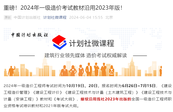 根据中国计划出版社发布信息可知,2024年一级造价师考试教材不会变动,依旧沿用2023年版。