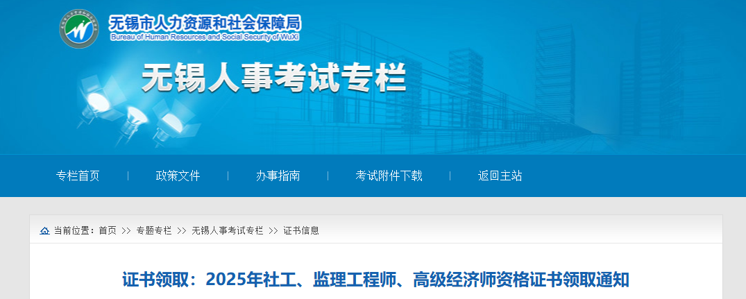9月10日,无锡市人力资源和社会保障局发布了“2025年监理工程师资格证书领取通知”,可采用申请邮寄或现场领取两种方式,考生自主选择。