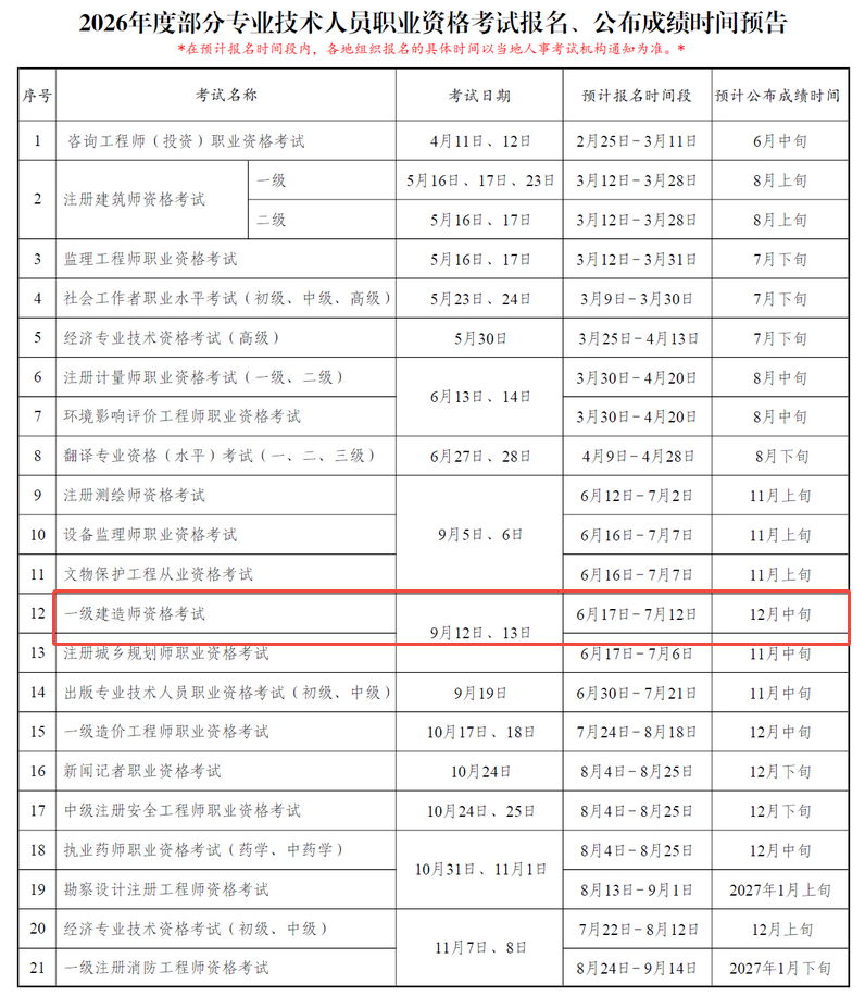 中国人事考试网发布《2026年度专业技术人员职业资格考试重要提示》。其中预告了2026年一建考试的报名入口开放时间和预计出成绩时间。