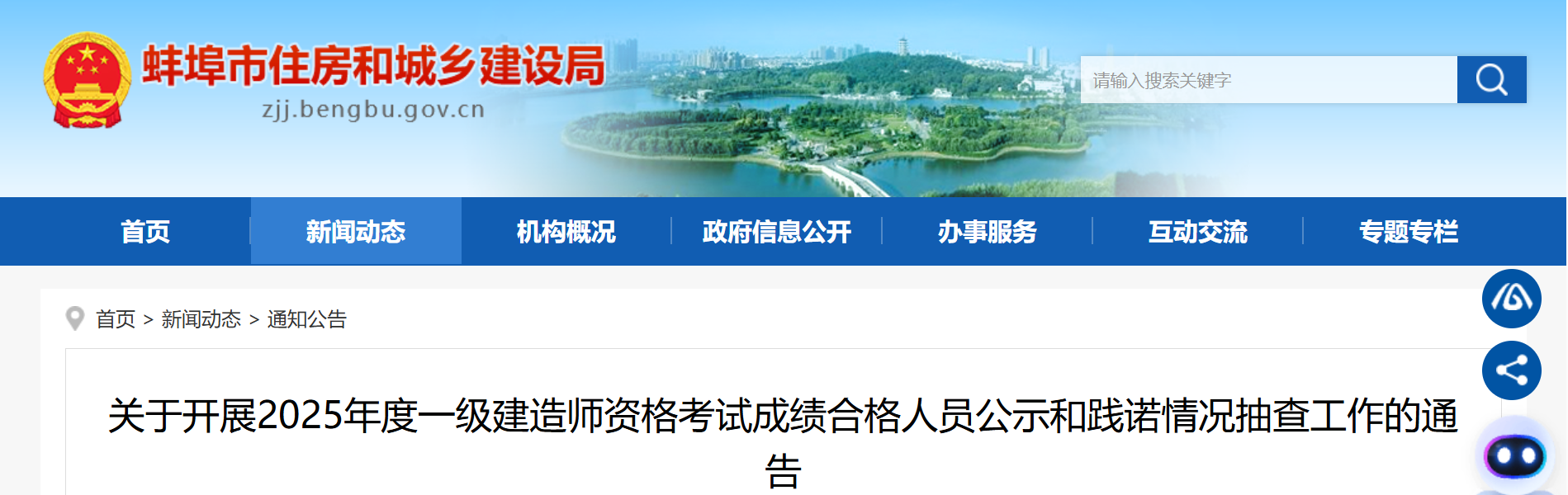 接上级部门通知,市人社局、市住建局于近期联合开展安徽省蚌埠市考区2025年度一级建造师资格考试成绩合格人员公示和践诺情况随机抽查工作。现将有关情况通告如下。