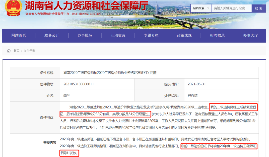 2020年,湖南人社厅有一则关于二造证书发放留言,内容划重点:我们二级造价师经过成绩复查登记,后考试院查明原统分58分有误,实际分数是61分已经通过。