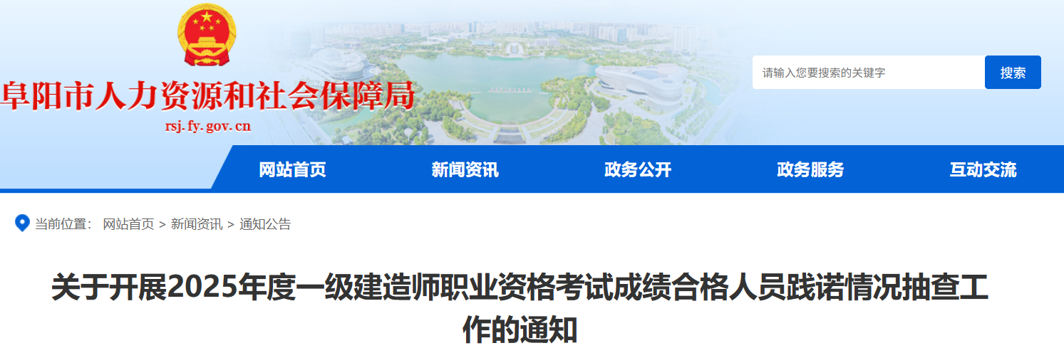 为落实专业技术资格考试事中事后监管职责,确保告知承诺制试点工作顺利推进,根据省人力资源社会保障厅《关于专业技术人员资格考试告知承诺制试点工作有关事宜的通知》(皖人社秘〔2020〕41号)要求,于近期开展阜阳考区2025 年度一级建造师职业资格考试成绩合格人员践诺情况进行随机抽查工作,现将有关情况通知如下。