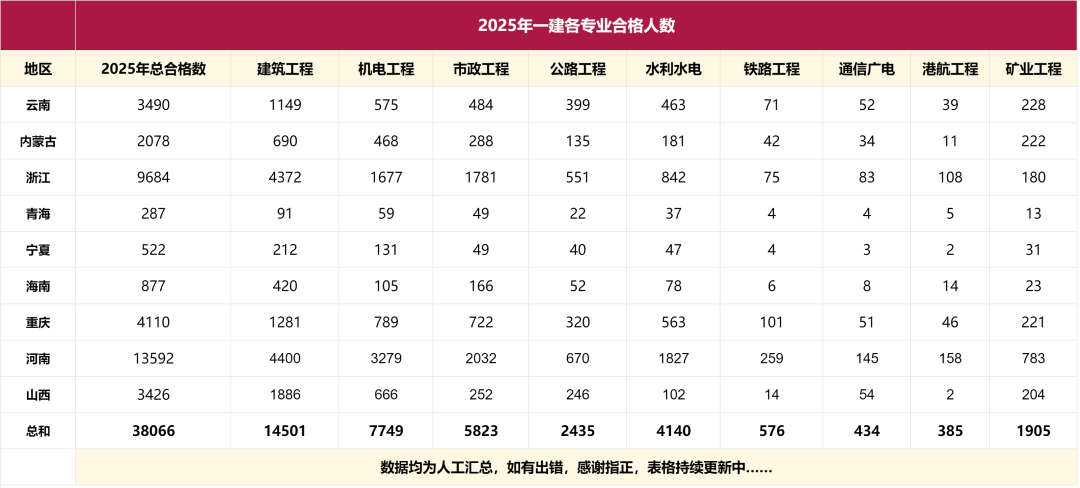 今年的一级建造师考试多个地区合格人员名单已经发布,根据各地的合格信息,我汇总了一份各专业的合格人数分布。