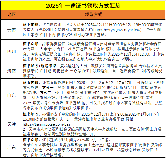 目前已开通25年一建纸质证书直邮服务的地区包括:云南、四川、海南、山东、天津、广东。如果错过邮寄申请时间,也不用担心,可以等待官方发布的现场领取通知即可。