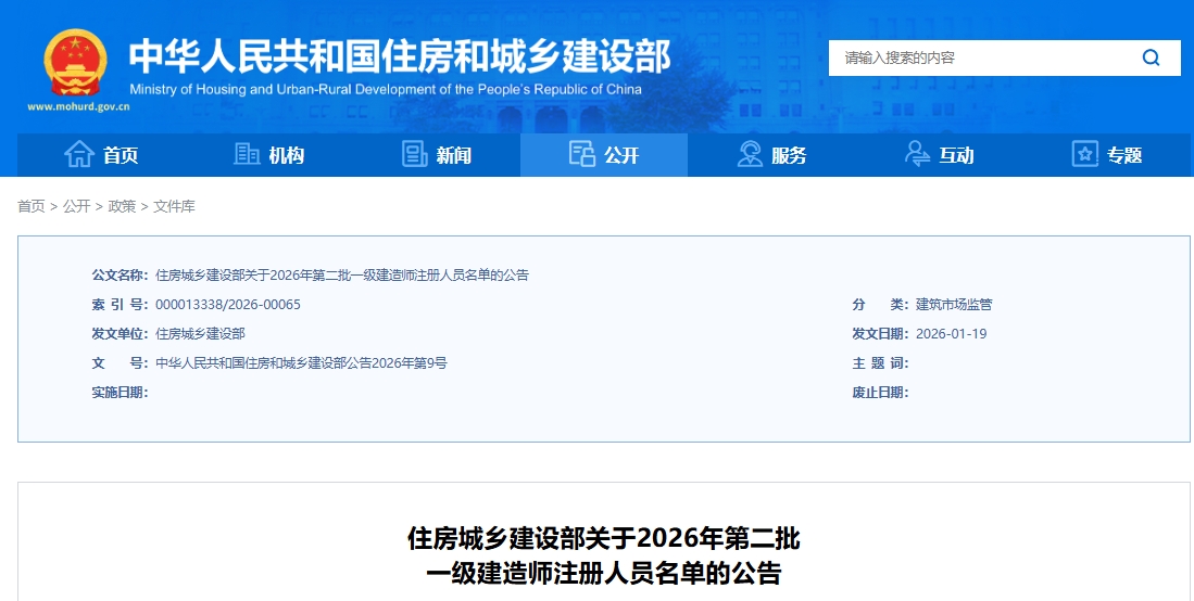 1月26日,中华人民共和国住房和城乡建设部发布《住房城乡建设部关于2026年第二批一级建造师注册人员名单的公告》,明确2026年度第二批一级建造师符合注册条件人员共29509名。