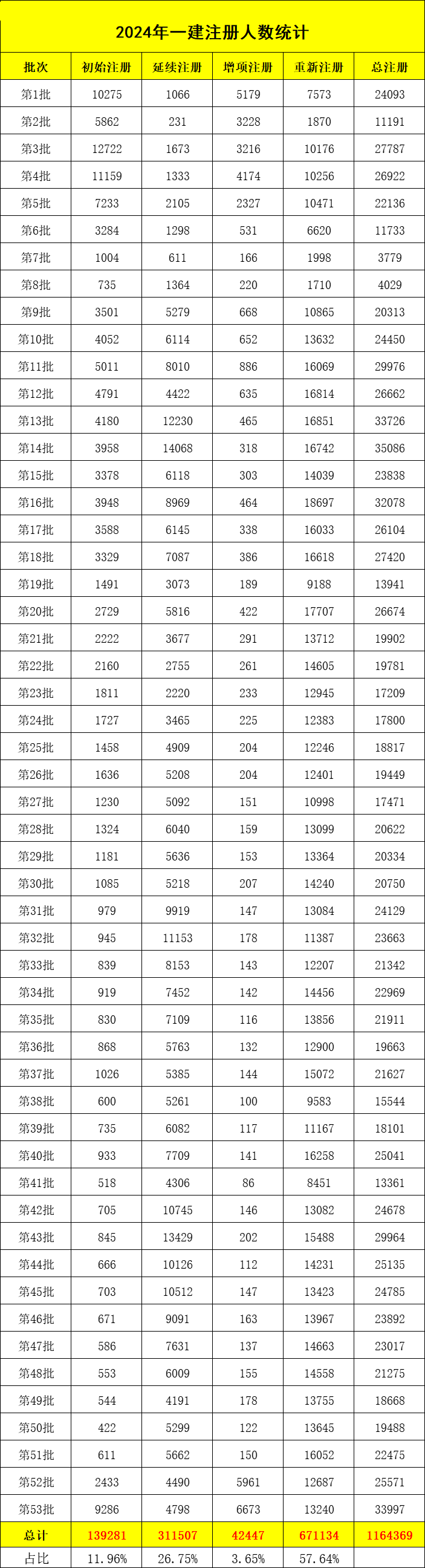 说明:去年总共公布了53批注册名单,今年只公布了51批注册名单。2024年一级建造师注册人数统计如下: