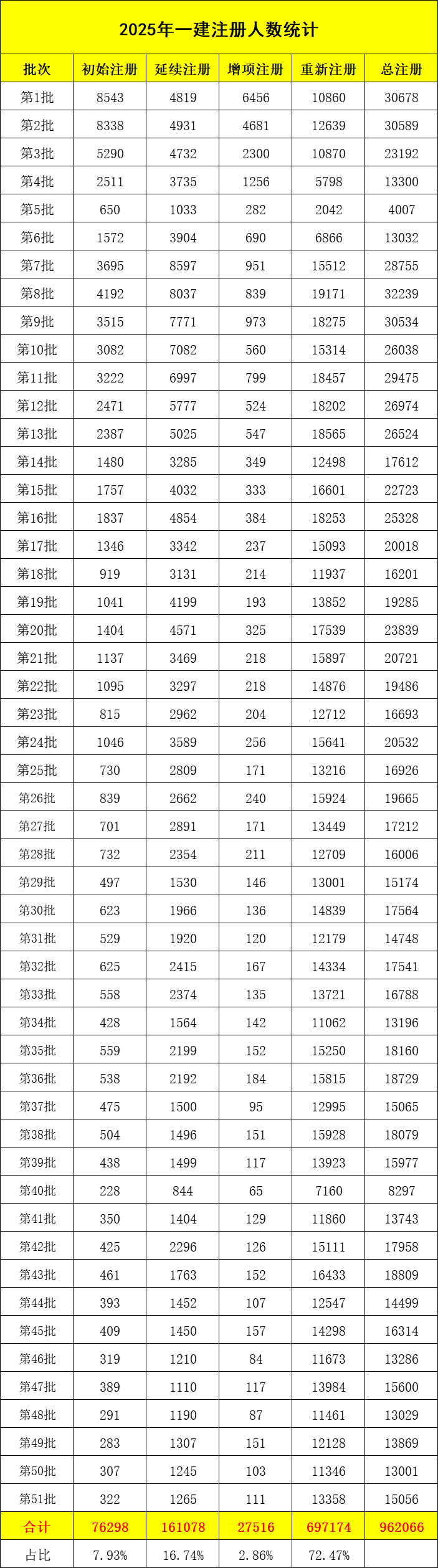 截止目前,住建部已公布了2025年一级建造师注册人员名单,总共51批次,总注册人数为962066人,其中,初始注册76298人,占比7.93%;延续注册161078人,占比16.74%;增项注册27516人,占比2.86%;重新注册697174人,占比72.47%。