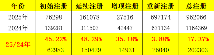 👉2025年对比2024年一级建造师注册人员数据如下: