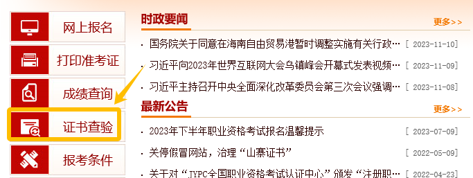 第一步:进入中国人事考试网(http://www.cpta.com.cn/),点击左侧【证书查验】栏目。