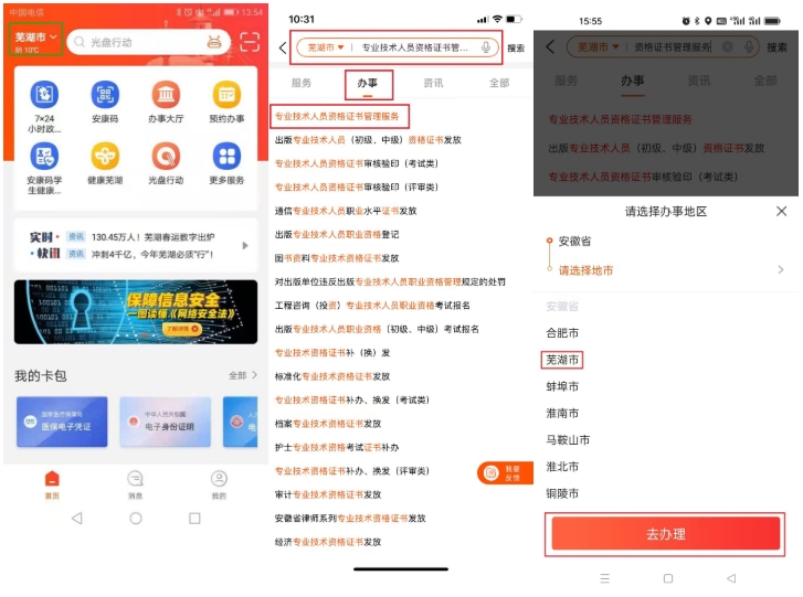 邮寄方式:方式1:移动端申请(推荐使用),手机下载皖事通APP,城市选择芜湖,搜索栏搜索“专业技术人员资格证书管理服务”,在线办理。