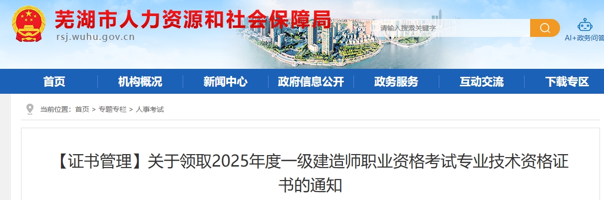1月19日,芜湖市人力资源和社会保障局发布《关于领取2025年度一级建造师职业资格考试专业技术资格证书的通知》,明确芜湖2025年度一级建造师职业资格考试专业技术资格证书开始发放。