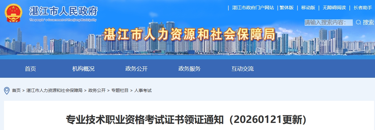 1月21日,湛江市人力资源和社会保障局发布《专业技术职业资格考试证书领证通知(20260121更新)》,明确广东湛江2025年度一级建造师职业资格考试合格证书开始发放,证书领取提供邮寄领取和现场领取两种方式。