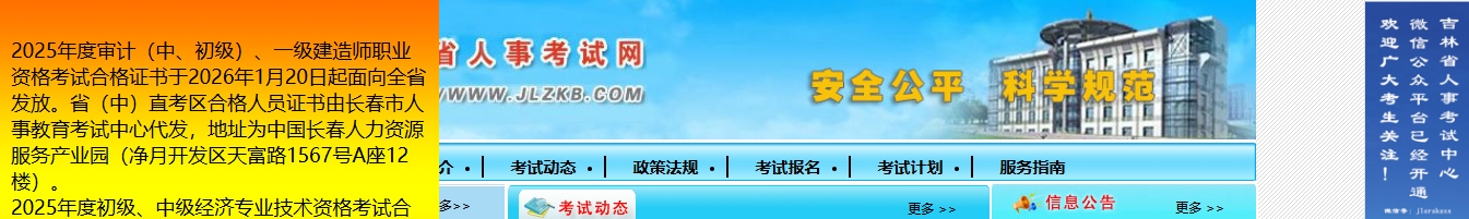 2025年度审计(中、初级)、一级建造师职业资格考试合格证书于2026年1月20日起面向全省发放。省(中)直考区合格人员证书由长春市人事教育考试中心代发,地址为中国长春人力资源服务产业园(净月开发区天富路1567号A座12楼)。