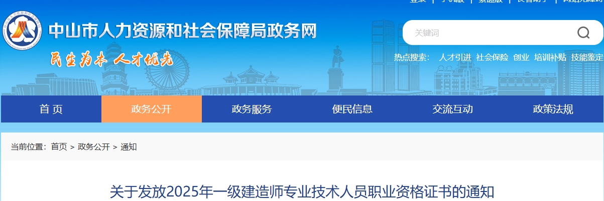 1月21日,中山市人力资源和社会保障局政务网发布《关于发放2025年一级建造师专业技术人员职业资格证书的通知》,明确广东中山2025年一级建造师专业技术人员职业资格证书于即日起发放,考生可选择邮寄到付或现场领取。