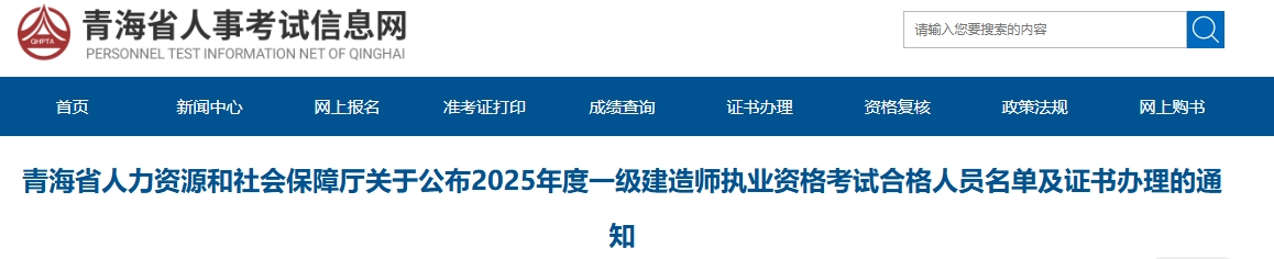 1月14日,青海省人事考试信息网发布《青海省人力资源和社会保障厅关于公布2025年度一级建造师执业资格考试合格人员名单及证书办理的通知》,明确青海2025年度一级建造师证书开始办理,证书集中办理时间为2026年1月至3月。