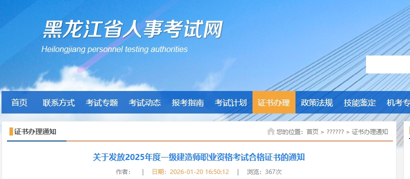1月20日,黑龙江省人事考试网发布《关于发放2025年度一级建造师职业资格考试合格证书的通知》,明确黑龙江2025年度一级建造师职业资格考试合格证书于2026年1月21日开始发放,证书领取提供邮寄领取和现场领取两种方式,供考生自主选择。