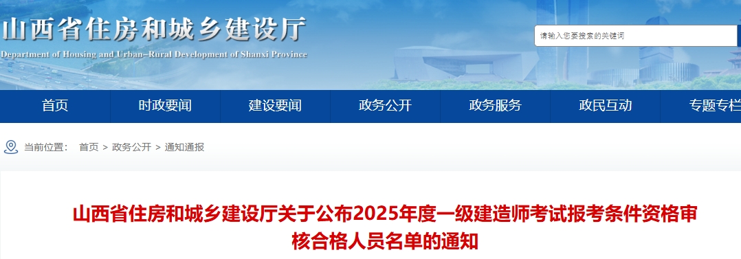 12月31日,山西住建厅发布《山西省住房和城乡建设厅关于公布2025年度一级建造师考试报考条件资格审核合格人员名单的通知》,对3426名考试成绩合格报考人员的报考条件开展资格审核,其中3417名审核合格。