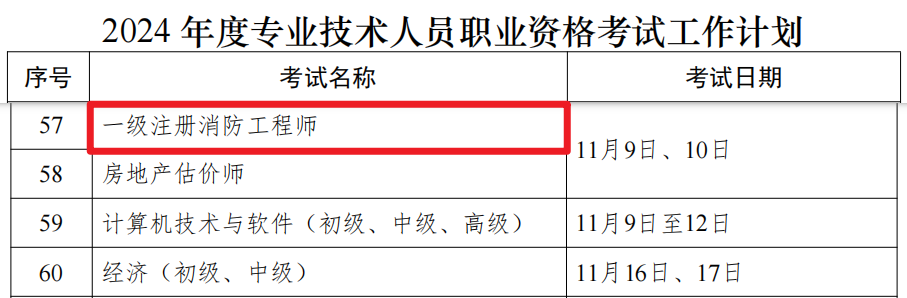 根据中华人民共和国人力资源和社会保障部发布的通知来看,2024年一级消防工程师考试时间为11月9日、10日。该考试共包含三个科目,考试分为3个半天进行,各科目考试并非连续进行,有较长的间隔时间可以供应试人员休息、备考。