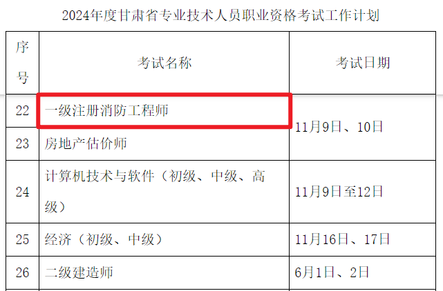 根据《关于公布2024年度甘肃省专业技术人员职业资格考试计划的公告》可知,2024年甘肃一级消防工程师考试在11月举行,考试时间为11月9日、10日。