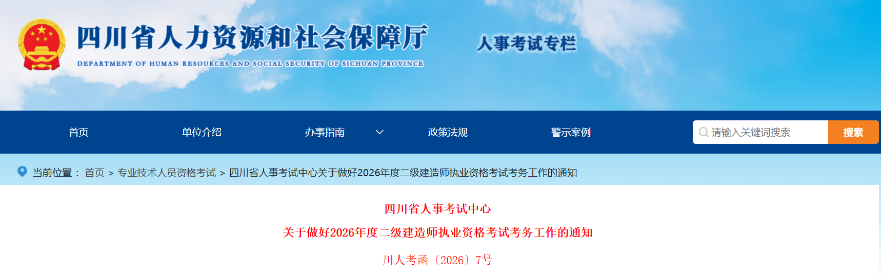 四川省人事考试中心官网于3月2日发布《关于做好2026年度二级建造师执业资格考试考务工作的通知》,通知中明确了2026年四川二级建造师考试时间、考试科目及考试设置及报考条件、报名时间等各项安排,考生务必认真阅读报名通知,按时报名。