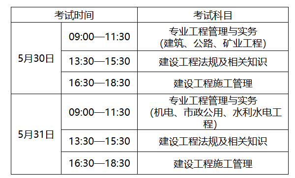 二级建造师资格考试设《建设工程施工管理》(客观题)、《建设工程法规及相关知识》(客观题)和《专业工程管理与实务》(主、客观题混合)3个科目。其中《建设工程施工管理》和《建设工程法规及相关知识》为基础科目;《专业工程管理与实务》为专业科目,分为公路工程、水利水电工程、市政公用工程、建筑工程、矿业工程和机电工程6个专业类别,报考人员可根据实际工作需要在1个考试年度内选择其中1个专业报考。具体考试时间及科目如下: