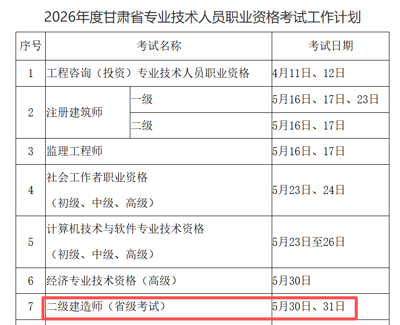 甘肃人事考试网于2月11日发布《关于2026年度甘肃省专业技术人员职业资格考试计划及有关事项的通知》,以上通知中明确了2026年甘肃专业技术人员职业资格考试计划及有关事项,确定了29项考试2026年考试时间,包括二级建造师考试,2026年甘肃二级建造师考试时间为5月30-31日。