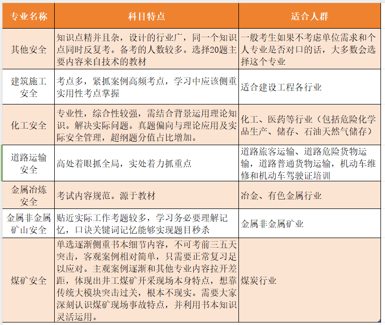 专业的选择:化工、建筑和其他专业是三大热门专业,用的比较多,目前化工和建筑是要求强配注安!但是化工的难度要比其他安全大很多,如果是想入行或者就是想考个证,建议选其他专业!