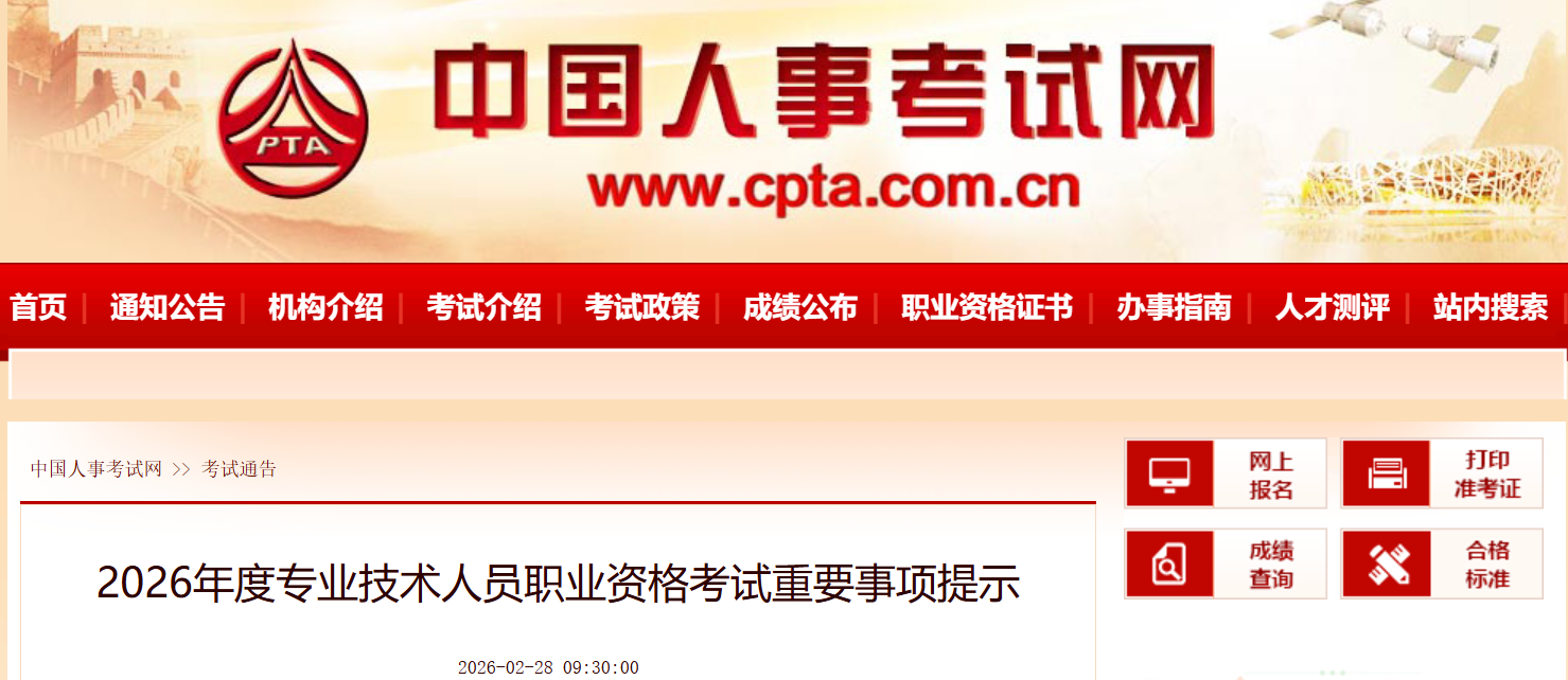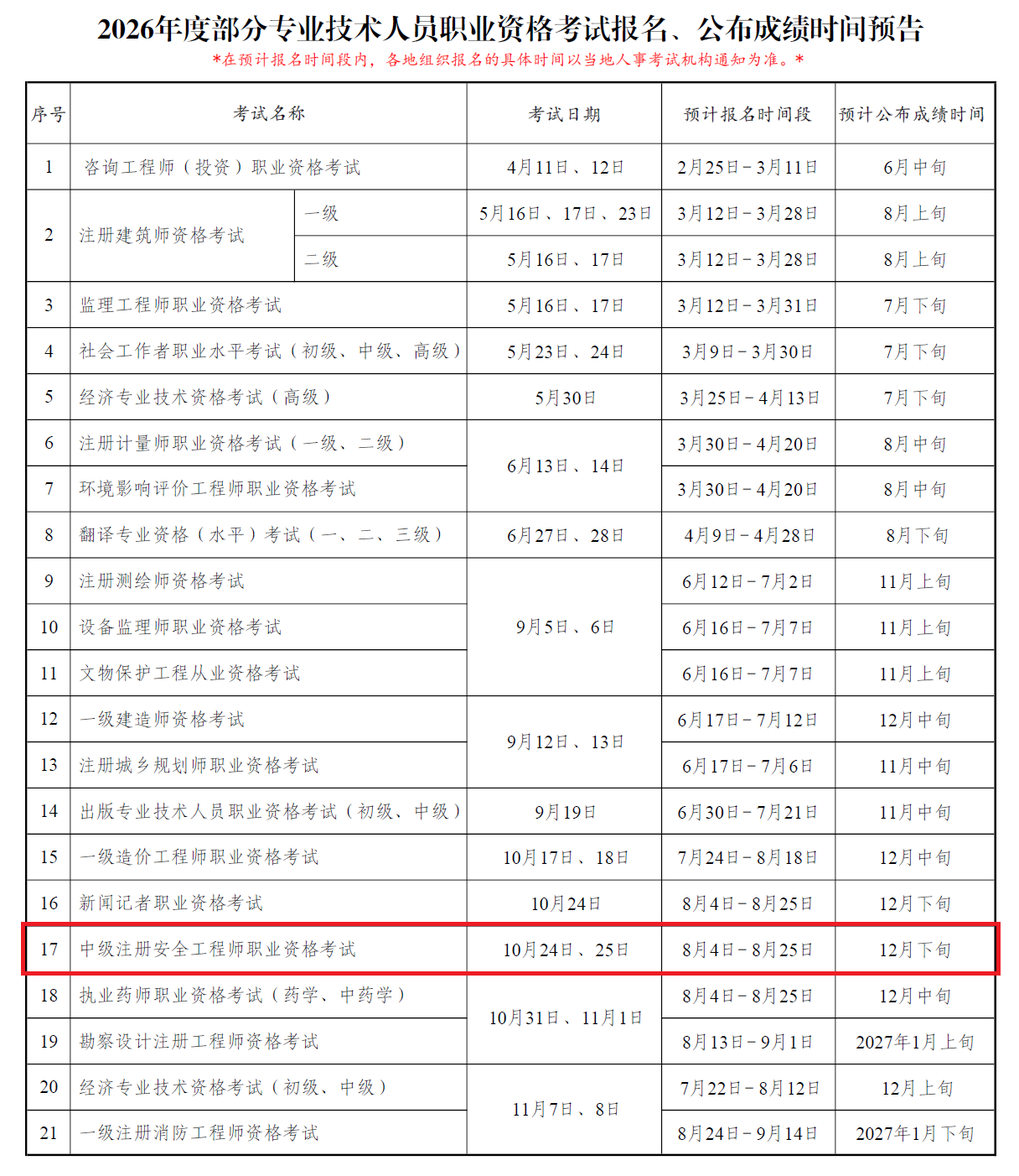 2026年2月28日,中国人事考试网发布了《2026年度专业技术人员职业资格考试重要事项提示》,确定2026年中级注册安全工程师报名时间为8月4日-25日。