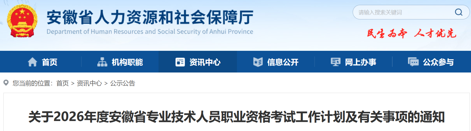 为切实做好专业技术人员职业资格考试规划和管理服务工作,根据人力资源社会保障部办公厅《关于2026年度专业技术人员职业资格考试工作计划及有关事项的通知》(人社厅函〔2026〕6号)要求,结合我省实际,商有关部门同意,现就2026年度安徽省专业技术人员职业资格考试工作计划及有关事项通知如下: